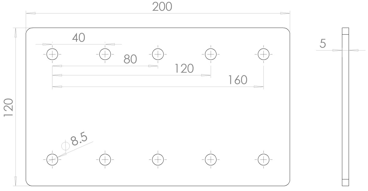 Our high-quality aluminum plate 120x200 allows you to easily connect two aluminum profiles from the 40 series. With precise craftsmanship, a thickness of 5 mm, and 8.5 mm diameter holes, the assembly process becomes quick, simple, and reliable.