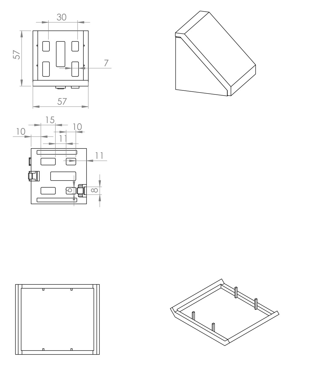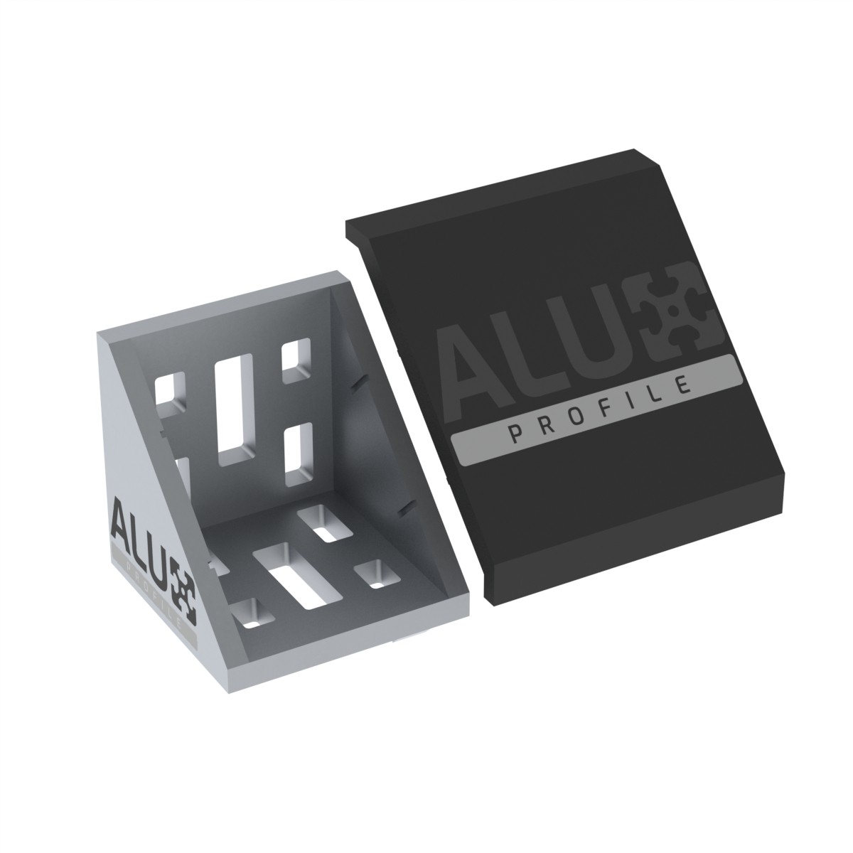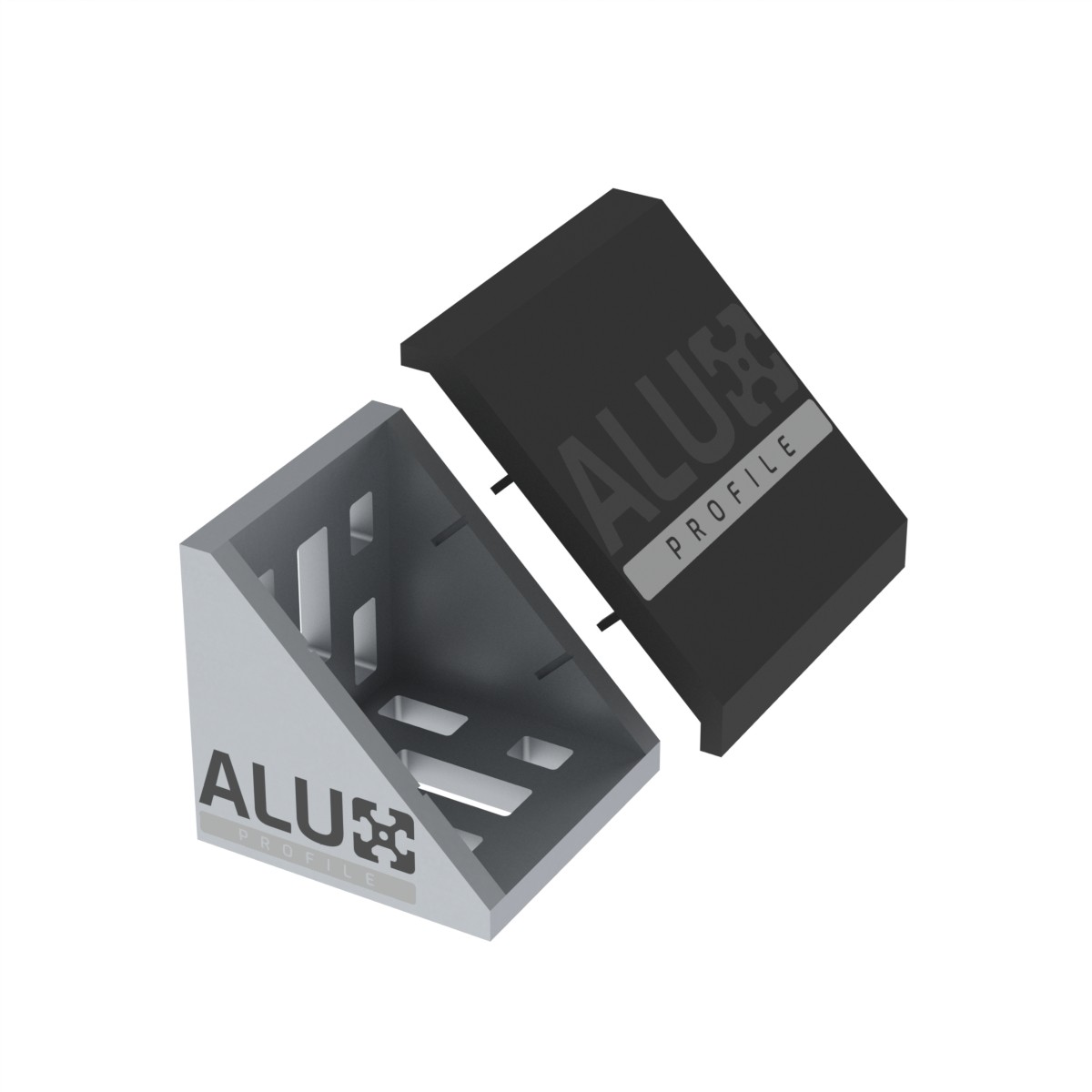 Corner bracket 6060. This cast aluminium corner bracket is 57mm wide and 57mm high. The bracket can be ordered with matching cover cap. The centering legs on the corner bracket are 6mm and 8mm wide, which makes this bracket suitable for use with 6mm and 8mm T-slot profiles. The centering legs can be easily broken off using a flat-blade screwdriver, resluting in a flat area on the corner bracket for easy mounting to plates or mounting perpendicular to the T-slot.