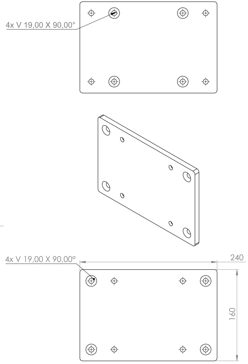 The T-connector plate 160×240 mm (10 mm thick) is a heavy-duty mounting plate designed for a rigid 90° T-joint between a 40×160 mm aluminum profile and a 40×160 mm aluminum profile. It’s a great option for ultra-stiff sim racing chassis and for industrial frames in automation, machinery, and production environments.